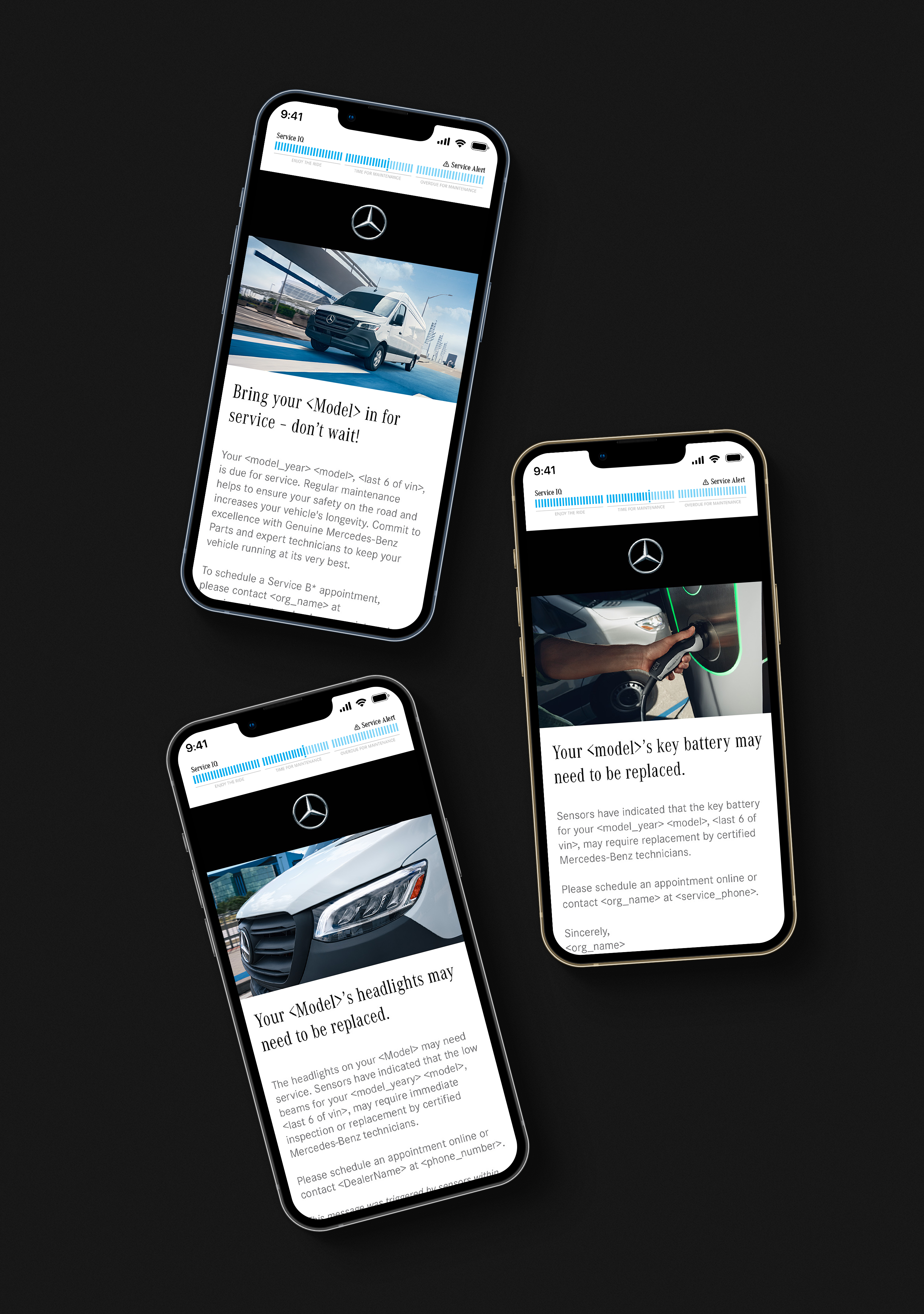 Tied to each vehicle’s VIN, the MBV Service Journey includes scheduled communications and triggered notifications. For services such as oil changes, tire rotations, and key fob battery replacements, customers receive notifications based on mileage or time intervals. This chain of communications helps ensure timely, convenient, and high-quality service experiences while enhancing vehicle longevity and reliability.